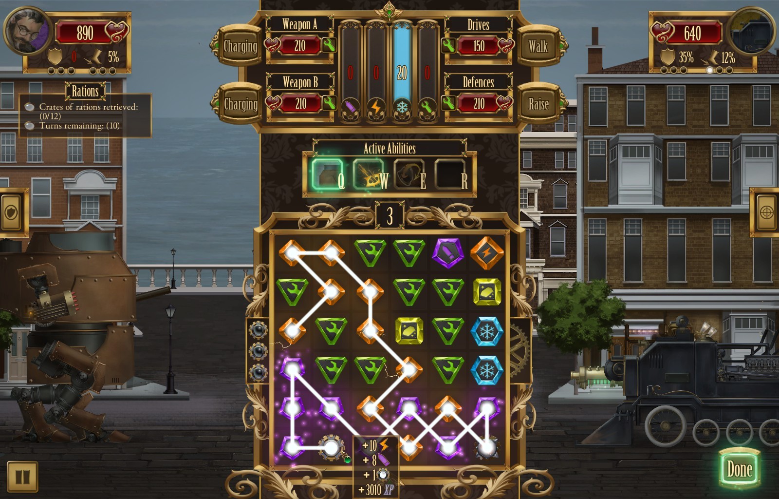 Der Ausklang? Vor allem Ironcast, dazu haben ich eine regelrechte Hass-Liebe entwickelt. Eigentlich gefällt mir das Spielprinzip, das ähnlich wie Puzzle Quest ein Match-3 System im Kampf nutzt. Zwar nicht so direkt, man sammelt Ressourcen um seinen Steampunk Mech damit zu betreiben: Schilde, Waffe oder Reparaturen gehen schließlich nicht von alleine. Es werden auch keine Steine vertauscht sondern zu Ketten verknüpft, welche zusätzlich noch Erfahrungspunkte bringen. Als Rogue-lite werden diese nicht nur im aktuellen Spiel sondern auch für einen globalen Fortschritt genutzt, welcher zusätzliche Boni freischaltet.