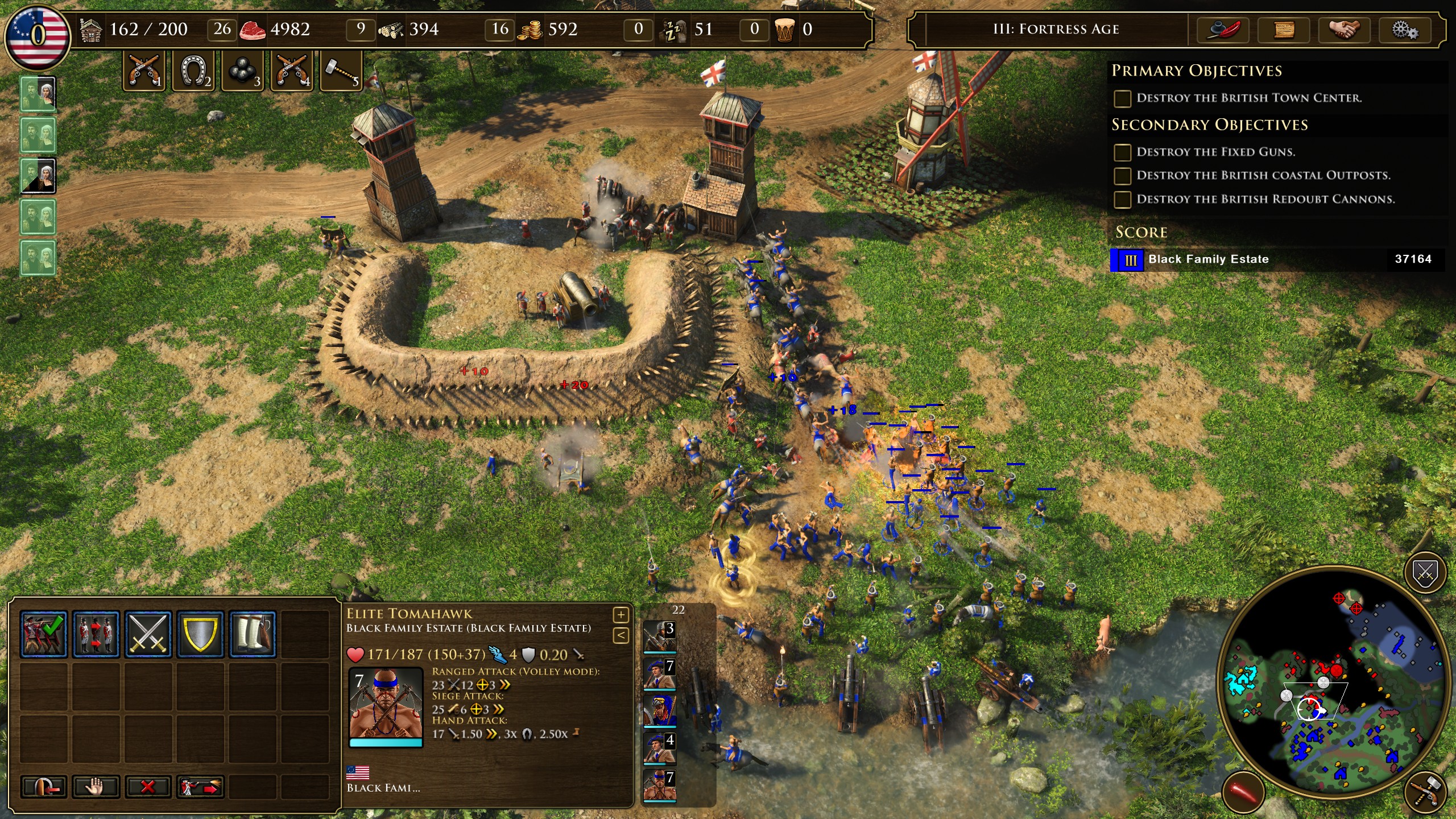 Die Völker sind deutlich unterschiedlicher als die mittlerweile 37 (!!!) des zweiten Teils. Im Grundspiel waren es gerade mal acht, die sich aber deutlich voneinander unterscheiden, teilweise schon angefangen an den Dorfbewohnern: Deutsche und Franzosen haben beispielsweise eigene, die deutlich stärker und effizienter sind, aber auch mehr kosten – ihr Verlust wiegt noch schwerer. Die Niederländer bilden ihre nicht mit Nahrung sondern nur gegen bare Münze aus (oder ich meisten sage: Gold, weil die Ressource immer so hieß), was der Wirtschaft eine andere Dynamik verleiht, ansonsten sind Münzen in den ersten Minuten eines Matches eher unwichtig. Und so geht es gerade weiter, auch wenn einige die selben Einheiten ins Feld führen und die selben Gebäude und Technologien haben, die Unterschiede sind deutlich und wirken sich direkt auf das Gameplay aus. Noch mehr Abwechslung kam mit den Addons rein, mit dem ersten The Warchiefs kamen drei Stämme amerikanischer Ureinwohner dazu, die davor nur als neutrale Fraktionen im Spiel vorhanden waren. Jede bringt wieder neue Einheiten, Gebäude und Eigenarten mit, wobei nicht alle ganz unumstritten waren: die Azteken, Lakota (im Original: Sioux) und Haudenosaunee (im Original: Irokesen) haben mit der Tanzgrube (Community Plaza in der Definitive Edition) ein Gebäude, das zwar starke Boni bringt, aber auch stark mystifiziert und keine korrekte Repräsentation ihrer Kultur darstellt. Später mehr dazu wie das in der Definitive Edition überarbeitet wurde. Im zweiten Addon The Asian Dynasties kamen, wer hätte es gedacht, drei Völker aus Asien dazu. Sie steigen anders ins nächste Zeitalter auf, nämlich indem sie ein Weltwunder bauen. Das hat die selbe Funktion wie die Auswahl der Politiker in den anderen Völkern (was stark an die Auswahl der kleinen Gottheiten in Age of Mythology erinnert), aber da kein Dorfzentrum damit blockiert wird kann man inzwischen weiter Dorfbewohner bauen – dafür werden aber bis zu acht zu Errichtung des Gebäudes gebunden. Sie bringen auch weitere, dauerhafte Boni, sofern das Gebäude nicht zerstört wird.