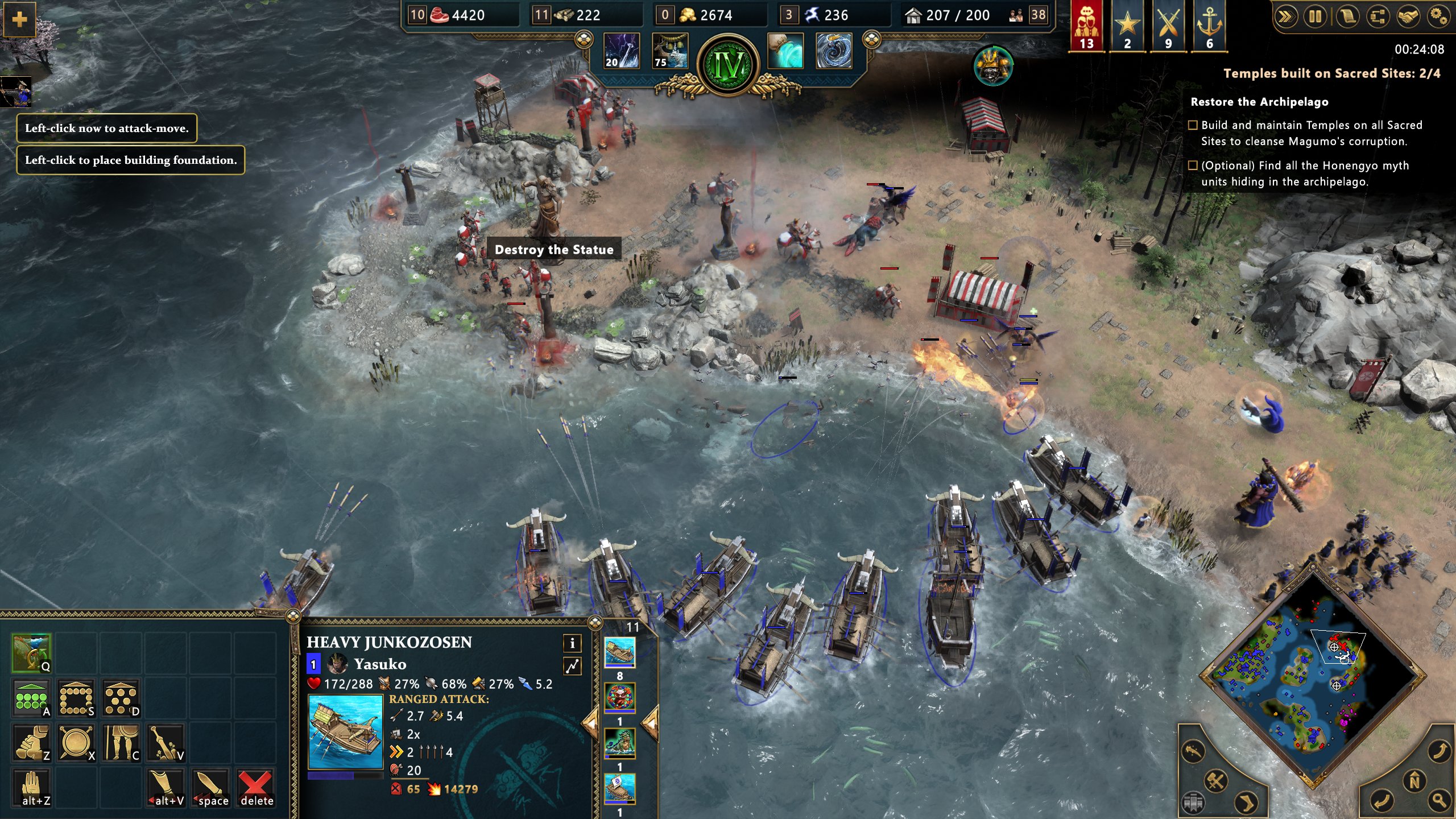 Für den Kampf gibt es in jedem der drei Gebäude je einen Heldeneinheit, die beliebig oft produziert werden kann. Die Auswahl an menschlichen Einheiten bewegt sich zwischen erwartbar (Samurai und Shinobi) zu ungewöhnlich (Belagerungs-Magier). Tendenziell sind sie etwas teurer und stärker als vergleichbare Einheiten anderer Zivilisationen im Spiel, eine japanische Armee ist deshalb meist etwas kleiner, was das Heilen durch die Mikos umso wichtiger macht. Dasselbe gilt für die mythologischen Kreaturen, dort sind ebenso einige sehr ungewöhnliche dabei – die japanische Mythologie erlaubt einige sehr abgefahrene Designs. Einzig vom Titan bin ich etwas enttäuscht, den finde ich irgendwie unpassend.