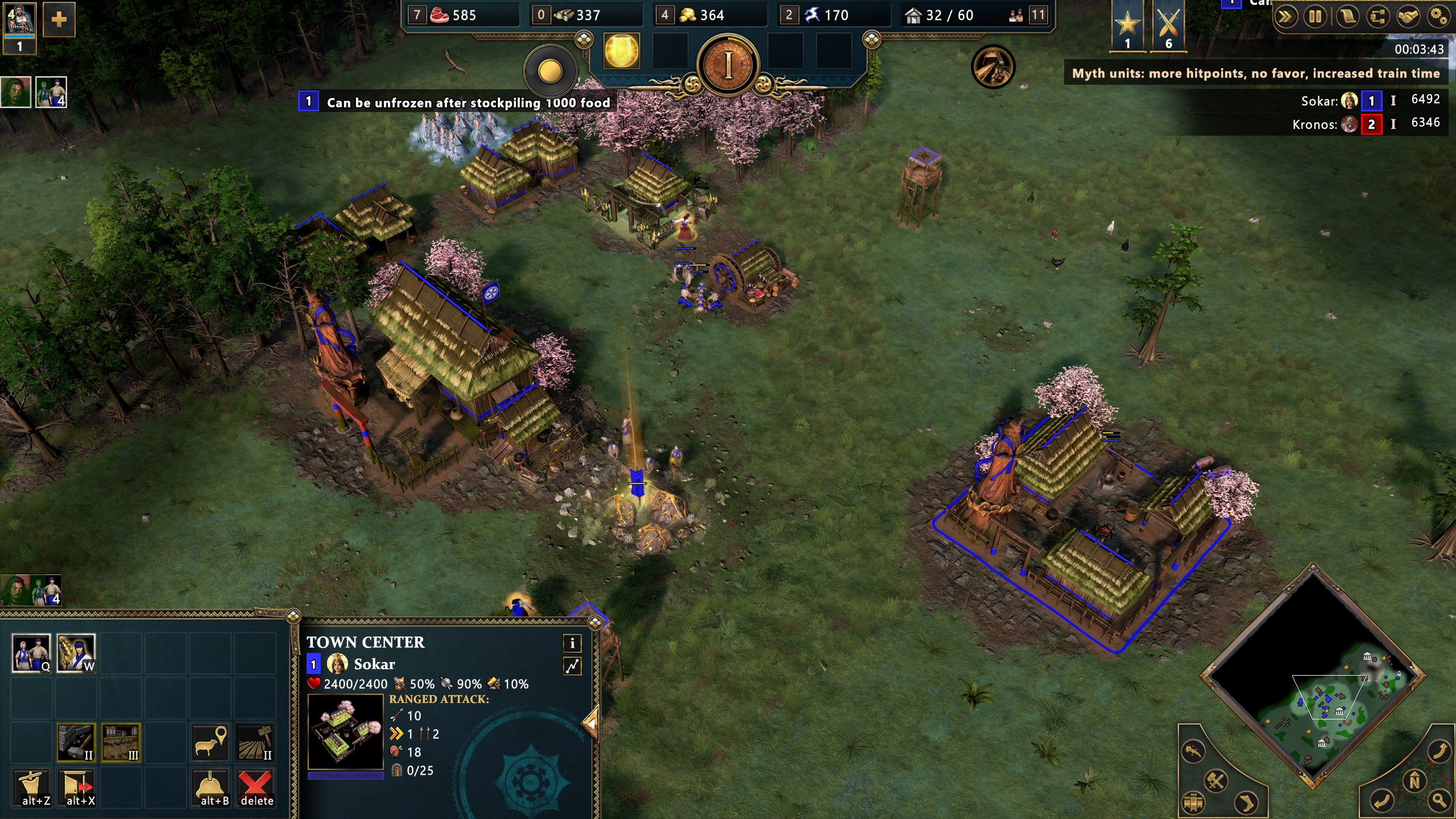 Ihre erste Heldeneinheit sind die Mikos, Priesterinnen, die gleichzeitig für die Produktion von Favor zuständig sind. Solange sie an einem Schrein beten (oder eher tanzen?), wird die göttliche Ressource produziert. Wieviel hängt auch davon ab, wie viele natürliche Ressourcen es in der Umgebung gibt. Das hat einen interessanten Aspekt, weil es belohnt, sich nicht wie sonst die Ressourcen möglichst schnell unter den Nagel zu reißen und abzubauen. Es kann sich also lohnen, die Schreine auf der Karte zu verteilen, was aber das Risiko birgt, dass der Gegner sie leichter zerstören kann. Eine wirklich interessante Idee und mal was Neues im RTS-Genre. Abseits davon heilen Mikos eigene Einheiten.