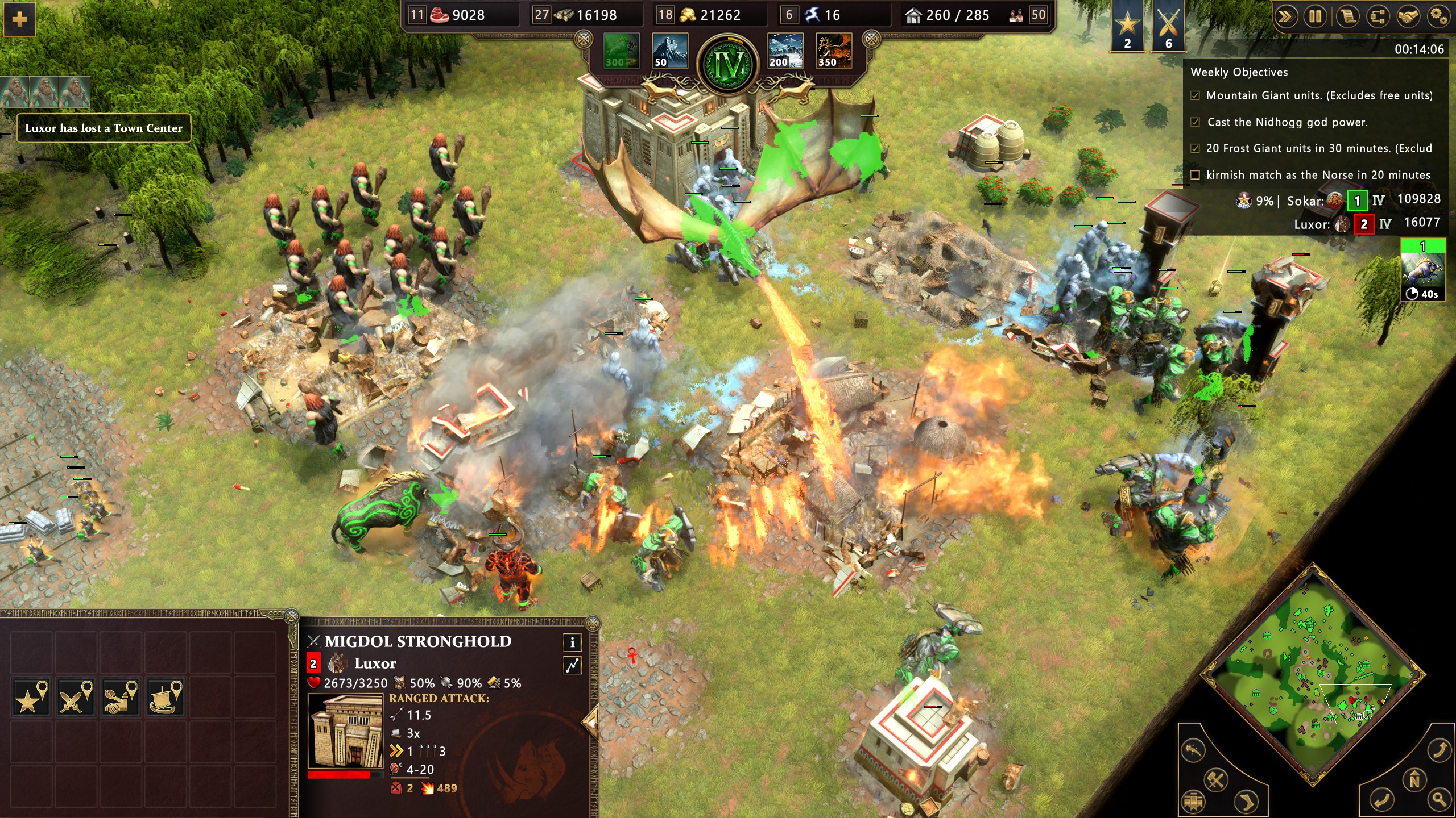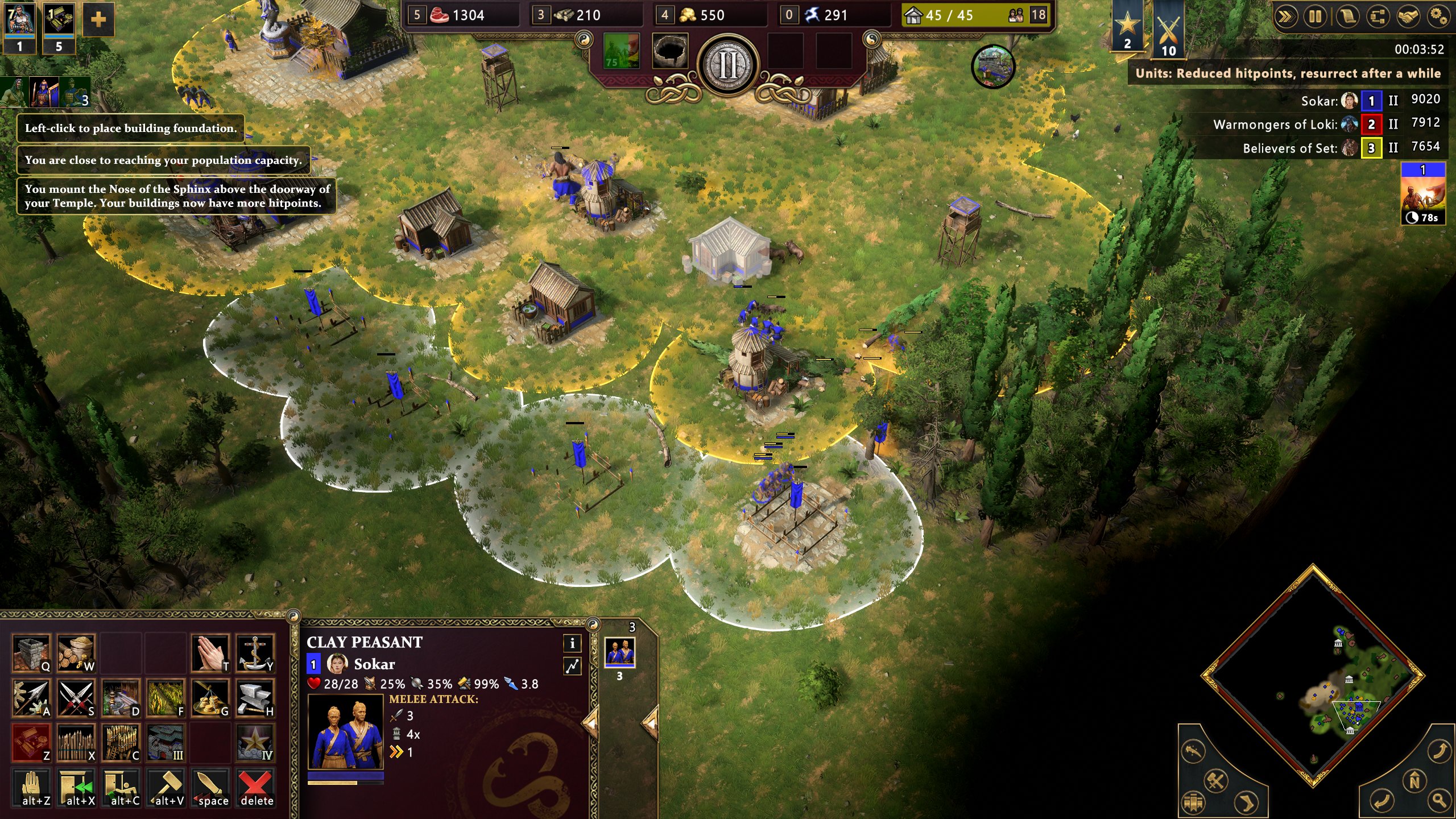 Jede Mission hat zudem besondere Bedienungen: In der erste Hälfte hat Gaia zusätzliche Einheiten auf der Karte zufällig verteilt, die Kastor in seine Armee aufnehmen kann. Zuerst muss er aber die entsprechende Bedingung erfüllen, wie ein Relikt sammeln oder 5000 Holz bunkern. In weiteren sorgt der Nordmänner-Gott Freyr für wechselnden Jahreszeiten mit besonderen Effekten, im Frühling arbeiten Dorfbewohner schneller, im Winter können sie kurzzeitig einfrieren. Zudem gibt es weitere Effekte, die andere Gottheiten angelehnt sind: Von Prometeus erhält man direkt zum Start ein sich selbst bauendes Titanen-Tor, das aber trotzdem eine Weile braucht und ich meist die Gegner schon vorher besiegt habe. Aphrodite verlangsamt die Produktion aller Arbeiter, dafür vermehren sie sich automatisch nach ein paar Minuten im Spiel. Ich habe wahrscheinlich erst einen Bruchteil davon gesehen, weil ich den Modus bisher nicht bis zum Ende gespielt habe. Alle diese Effekte sind nett, aber nichts, was das Spiel auf den Kopf stellt. Nette, kleine Variationen, mehr nicht.