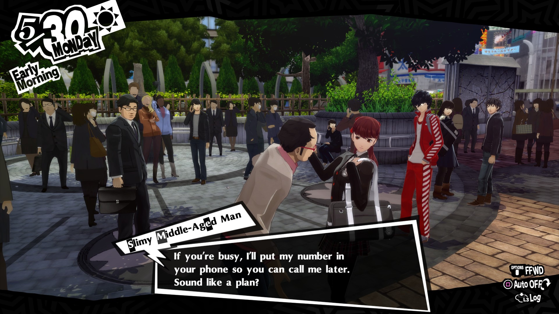 Die Confidants sind ein wichtiger Aspekt des Spiels, in Royal gibt es zwei Neuzugängen. Die erste ist die neue Mitschülerin Kasumi, erkennbar an ihren roten Haaren. Sie kommt kurz nach dem Protagnisten an die Schule und ist Turnerin. Ihr Skills helfen sich zu befreien wenn von Gegner eingekreist und ermöglichen es, einen Ambush-Angriff aus einiger Distanz zu starten. Sie interagiert größtenteils nur mit dem Protagonisten, in ein paar Social-Events trifft sie auch auf andere Mitglieder der Gruppe. Auffällig ist, dass sie zuerst nur fünf Confindant-Stufen hat. Soviel kann ich schonmal vorwegnehmen: im dritten Semester werden die weiteren fünf freigeschaltet. Allgemein spielt sie darin eine große Rollen, ebenso wie der zweite Neuzugang: Nach den Ereignissen des ersten Palastes kommt mit Dr. Maruki ein Therapeut an die Schule und bleibt für ein halbes Jahr, ziemlich genau bis zum Ende des sechsten Palastes. Seine Skills wirken sich nur auf den Protagonisten aus und geben eine Chance, Statusveränderungen direkt zu heilen, Buffs zu bekommen oder SP zu regenerieren.