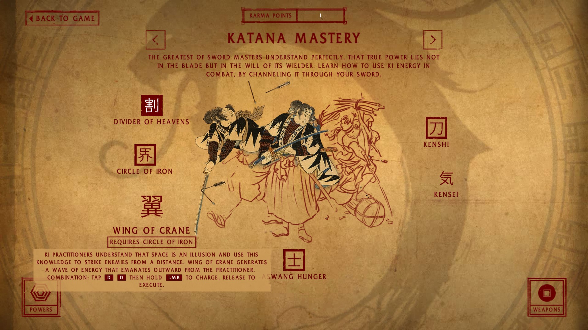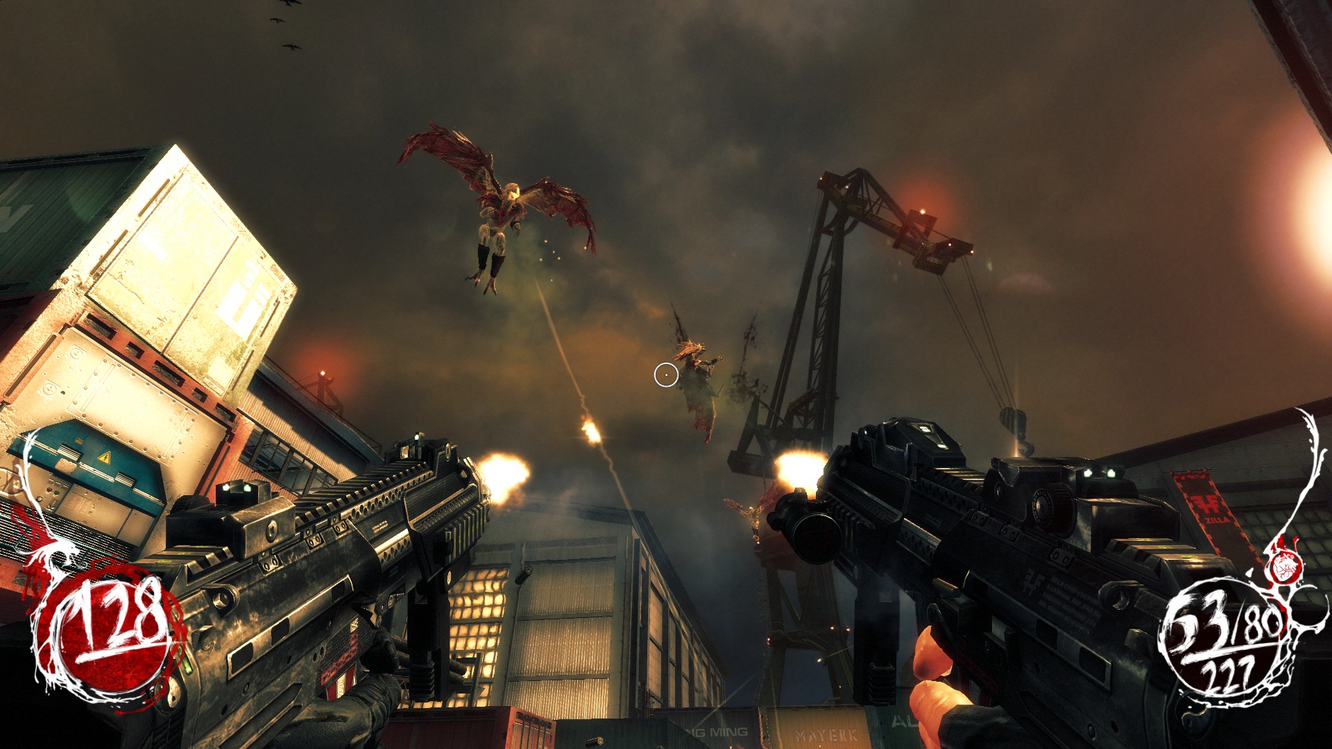 Und damit bin ich schon beim nächsten Punkt wären: dem Upgrade System. Das ist dreigeteilt in Waffen, Fähigkeiten und Skills. Alle Waffen verfügen über je drei Upgrades, welche gegen Geld freigeschalten werden, welches man in den Levels verteilt findet. Neben den Standards wie mehr Schaden oder Präzision hat jede auch einen zweiten Feuermodus: die Schrotflinte kann alle zwei (bzw. vier mit Upgrade) Läufe auf einen Schlag entleeren um massiven Schaden anzurichten, bei der Uzi kommt ein zweites Exemplar dazu und mit der Armbrust können Sticky-Bombs platziert werden. Alle Upgrades werden auch durch Erweiterungen am Modell der Waffel optisch sichtbar. Der zweite Abschnitt sind aktive Fähigkeiten, welche durch in den Levels gefundene Ki-Kristalle freigeschaltet werden und über Tatoos visualisiert werden, auch wenn man diese außerhalb des Menüs nicht zu Gesicht bekommt. Man hat jeweils eine Grundfähigkeit, welche in einem Baum in zwei Richtungen verbessert werden kann. Am nützlichsten ist hier die Heilfähigkeit, womit man auch innerhalb eines Kampfes einen Teil seiner Gesundheit wieder herstellen kann. Alle aktiven Fähigkeiten werden über das schnelle, zweifache drücken einer Bewegungstaste und dem drücken und halten der rechten Maustaste (ansonsten für den zweiten Feuermodus einer Waffe) aktiviert. Als letztes gibt es noch die größtenteils passiven Skills, welche bestimmte Aspekte verbessern, z.b. den Schaden gegen Dämonen oder die Summe des gefundenen Geldes und Munition. Eine Ausnahme sind die Skills mit dem Katana, welche spezielle Schläge freischalten. Man kann nun seine Energie zu einem sehr starken Schlag bündeln oder in einer Drehung alle Gegner um sich herum verletzten. Um diese Fähigkeiten freizuschalten ist Karma nötig, welches man in Form von gefundenen Blutansammlungen an dämonischen Opferaltären oder durch die Kämpfe selbst sammelt – für jeden ausgeschalteten Gegner bekommt man Karma je nachdem wie man ihn zur Strecke gebracht hat und am Ende gibt es nochmal einen Bonus, wobei ich mir nicht ganz sicher bin, wie der berechnet wird. Das ganze funktioniert ein wenig wie die Bulletpoints in BulletStorm, wenn auch bei weitem nicht so umfangreich und ohne die makaberen Namen.