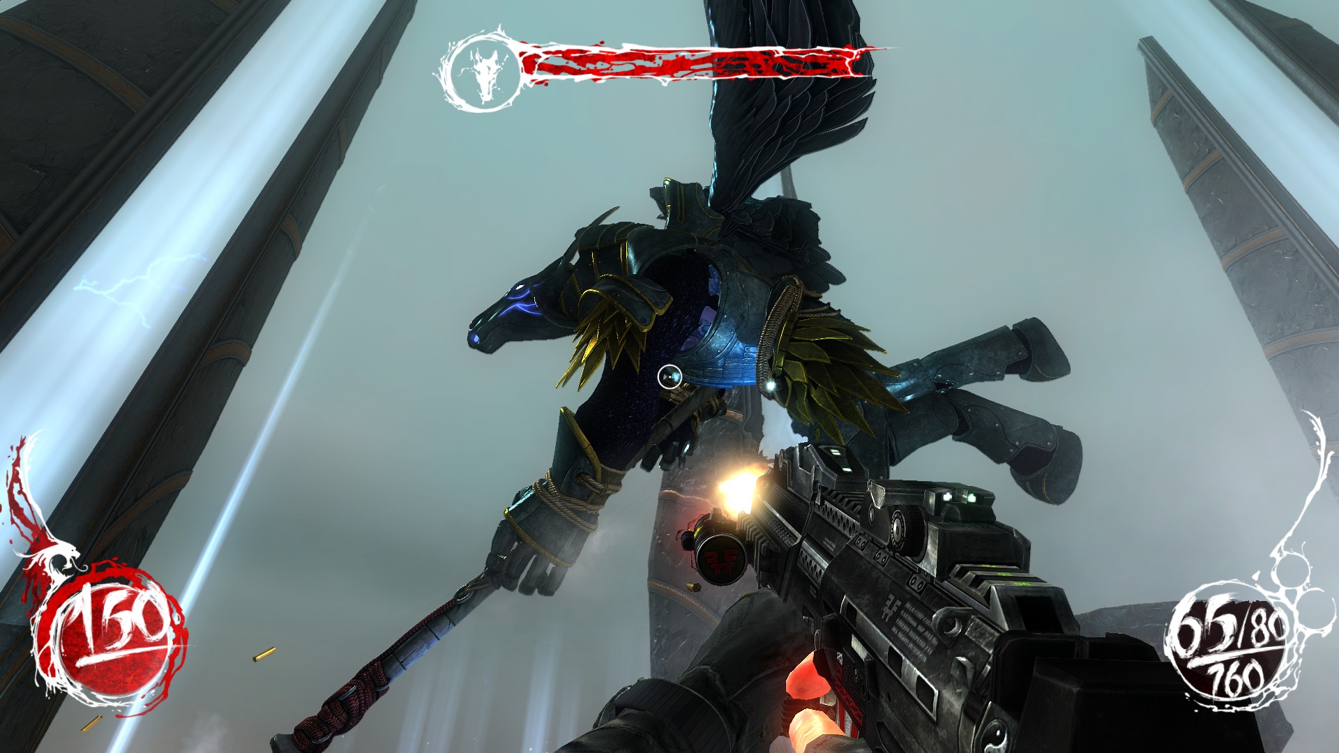 Die meisten Gegner stellen albtraumhafte Dämonen, die entsprechend aussehen – Zähne fletschende Grimassen mit großen Klauen stellen dabei nur die Grundform dar: Gegner mit Vogelköpfen, die Projektile verschießen, fliegende, an Harpyen erinnernde Gegner und Schmanen, die Skelette beschwören sorgen für eine gewissen Bandbreite an Gegner, wenn auch nicht übermäßig viele. Zudem werden, ganz in Serious-Sam-Traditon, ehemalige Mini-Bossgegner später zu normalen Gegnern, wobei es nicht ganz so schlimm ist – die großen Gegner bleiben gefährlich und es tauchen nie mehr als zwei gleichzeitig auf. Gefährlicher sind dagegen die Ninja-artigen Monster, welche im Nahkampf angreifen und sich unsichtbar machen können. Sie tauchen schon mal in größeren Gruppen auf, die besten Erfahrungen habe ich dabei mit dem Katana oder der Schrotflinte gemacht. Die Highlights sind die drei großen Bosskämpfe, welche Gegner in einer Größenordnung bieten, welche bisher nur PainKiller zu sehen gab – nämlich haushoch. Leider laufen die Kämpfe nur immer gleich ab: jeder Boss hat empfindliche Stellen, hat man sie ausreichend getroffen wird er kurzzeitig gelähmt und seine Ki-Kristalle werden freigelegt. Hat man sie alle zerschossen ist der Boss besiegt. Ansonsten unterscheiden sich die Bosse nur in Details wie der Größe der Flächen oder ihre Fähigkeiten, generell sollte man ihnen einfach nicht zu nahe kommen – genug Platz bieten die Bossarenen allemal.