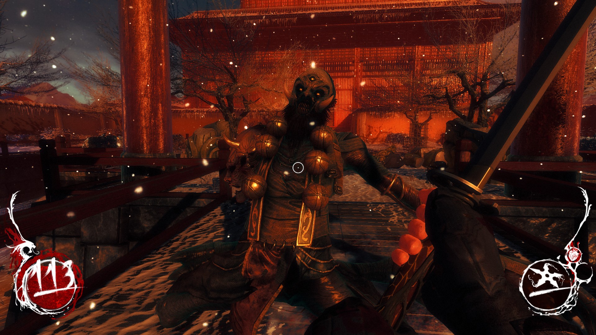 Das Leveldesign weiß zu überzeugen. Zwar sind die Levels tendenziell eher linear angelegt, sind aber keine kompletten Schläuche, meistens gibt es mehrere Wege zum Ziel, auch wenn sie nicht weit voneinander abweichen. Zudem lohnt sich das erkunden der Level, welches mit Munition, Geld und anderen Boni belohnt wird. Die Genre-typischen Secrets sind natürlich wieder dabei, die Schwierigkeit sie zu finden schwankt stark: es gibt einige, die kann man quasi nicht verfehlen, während andere sehr gut versteckt sind. Ich bin jetzt nicht gerade gut darin, sie zu finden, hab aber im Schnitt in jedem Level knapp die Hälfte gefunden, ohne übermäßig lange danach zu suchen. Die man manche Levels auch nicht-linear durchläuft wird die nächste Tür mit einem orangenen Leuchten markiert, was man zwar im Menü abschalten kann, aber ich höchst praktisch fand da es den Spielfluss aufrecht erhält. Ich hab mich dann aber doch das eine oder andere mal verlaufen, weil ich z.b. einen Schlüssel übersehen habe und deswegen nicht weiter kam – zuerst ist die Tür zum Raum mit dem Schlüssel noch markiert, hat man ihn aber einmal betreten wird das leuchten deaktiviert und man darf wie in alten Zeiten suchen. Da das Spiel in Japan spielt sind alle Schauplätze mehr oder weniger japanisch angehaucht, von den klischeehaften Kirschbäumen und Koi-Becken geht es in eine Vorstadt, durch Höhlen zu einem Hafen mit einem großen Schiff und zum Abschluss hoch in die verschneiten Berge. Alle Umgebungen sind sehr unterschiedliche und sorgen für Abwechslung während der knapp 12stündigen Kampagne, einen Multiplayermodus gibt es leider nicht.